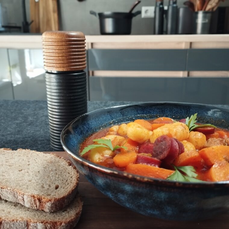 Das Hähnchen oder den Tofu zerschneiden. Keine Sorge, die Stücke müssen nicht aussehen wie im Kochbuch. Du isst es ja, nicht Instagram. Zwiebeln und Knoblauch? Klar, einfach hacken, bis sie klein genug sind. Kartoffeln schälen, würfeln, Karotten und Paprika in Scheiben schneiden. Du weißt schon, wie man das macht – oder improvisier, das geht immer.